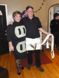 There are only a few times I’ve had dates for Halloween parties, and in none of those instances did I do a couple’s costume (although one year I was Martha Stewart and my fella was The Scream…hmm). One man I dated briefly in grad school disdained dressing up; for a party we went to, he wore the same green button-down he’d had on all day, stuck a single leaf in the breast pocket, and called himself a tree. Another date didn’t don a costume at all, unless you counted his black leather jacket and turtleneck.